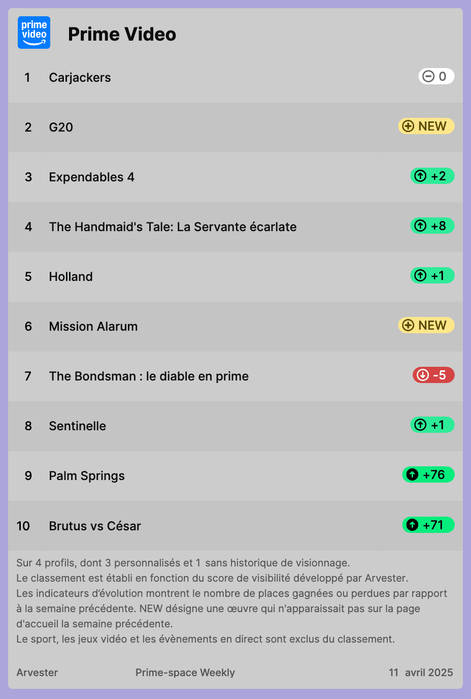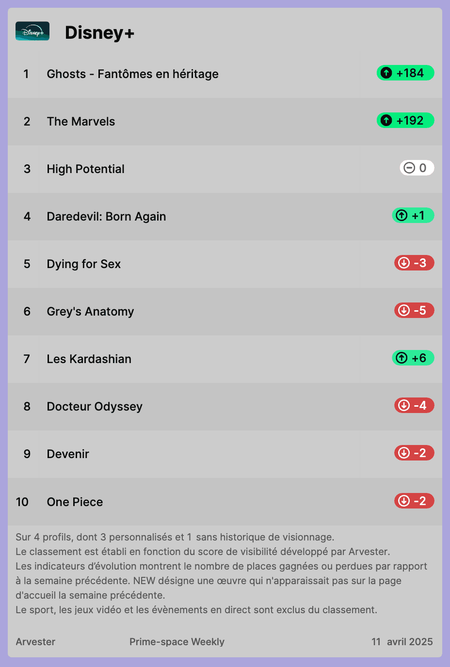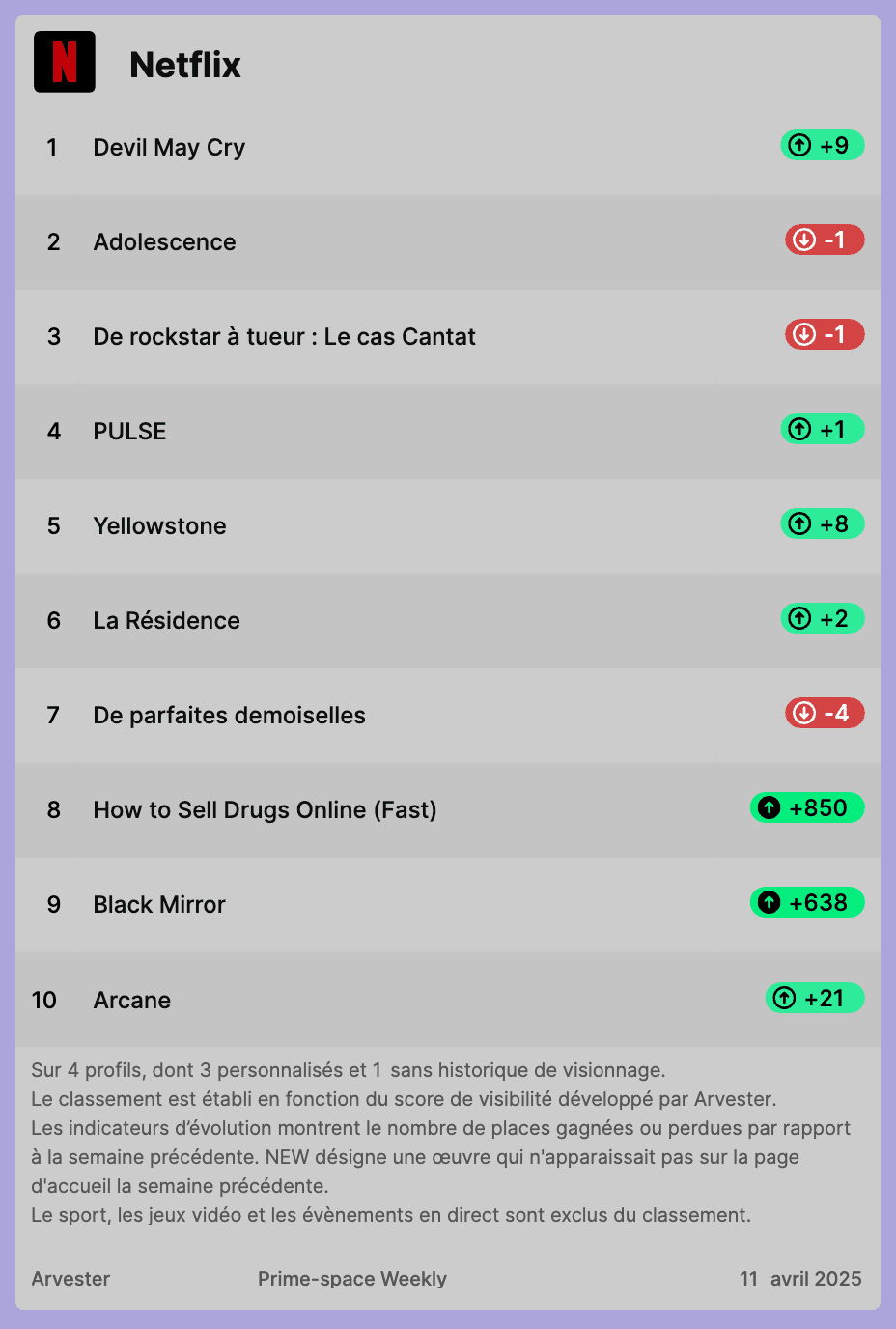 Vous trouverez ci-dessous les 10 titres les plus visibles sur Netflix, Prime Video et Disney+ en France. Plus d'infos sur notre méthodologie en bas de page.