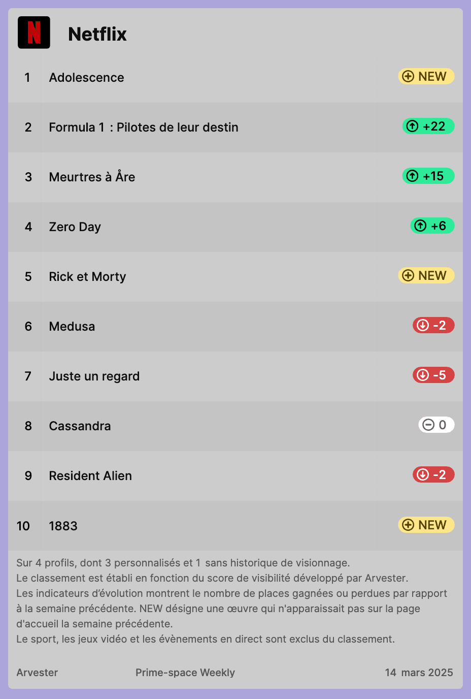 Notre classement hebdomadaire des titres les plus visibles sur Netflix, Prime Video et Disney+.