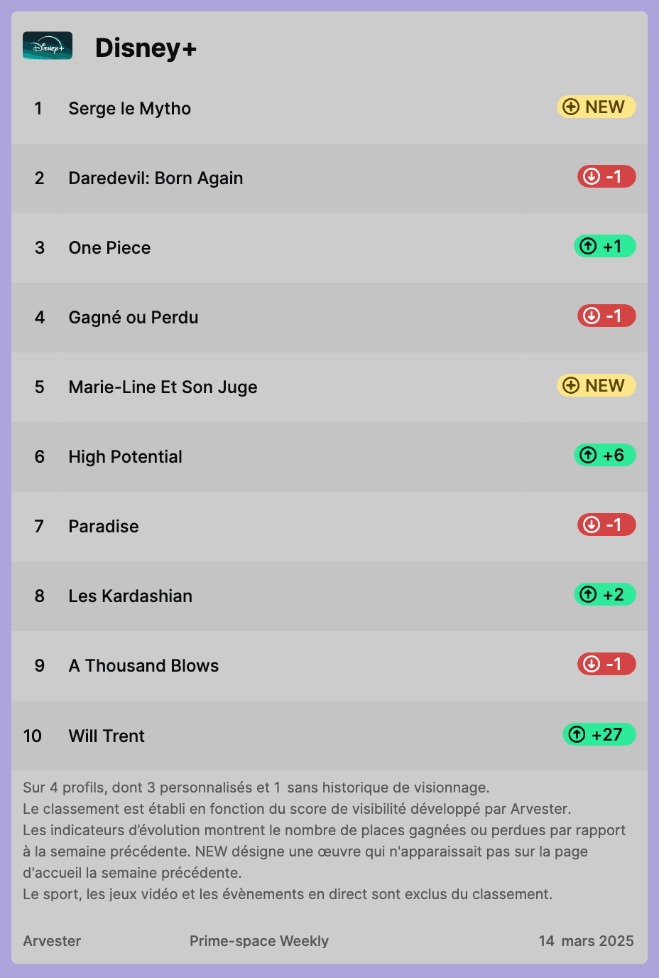 Vous trouverez ci-dessous les 10 titres les plus visibles sur Netflix, Prime Video et Disney+ en France. Plus d'infos sur notre méthodologie en bas de page.