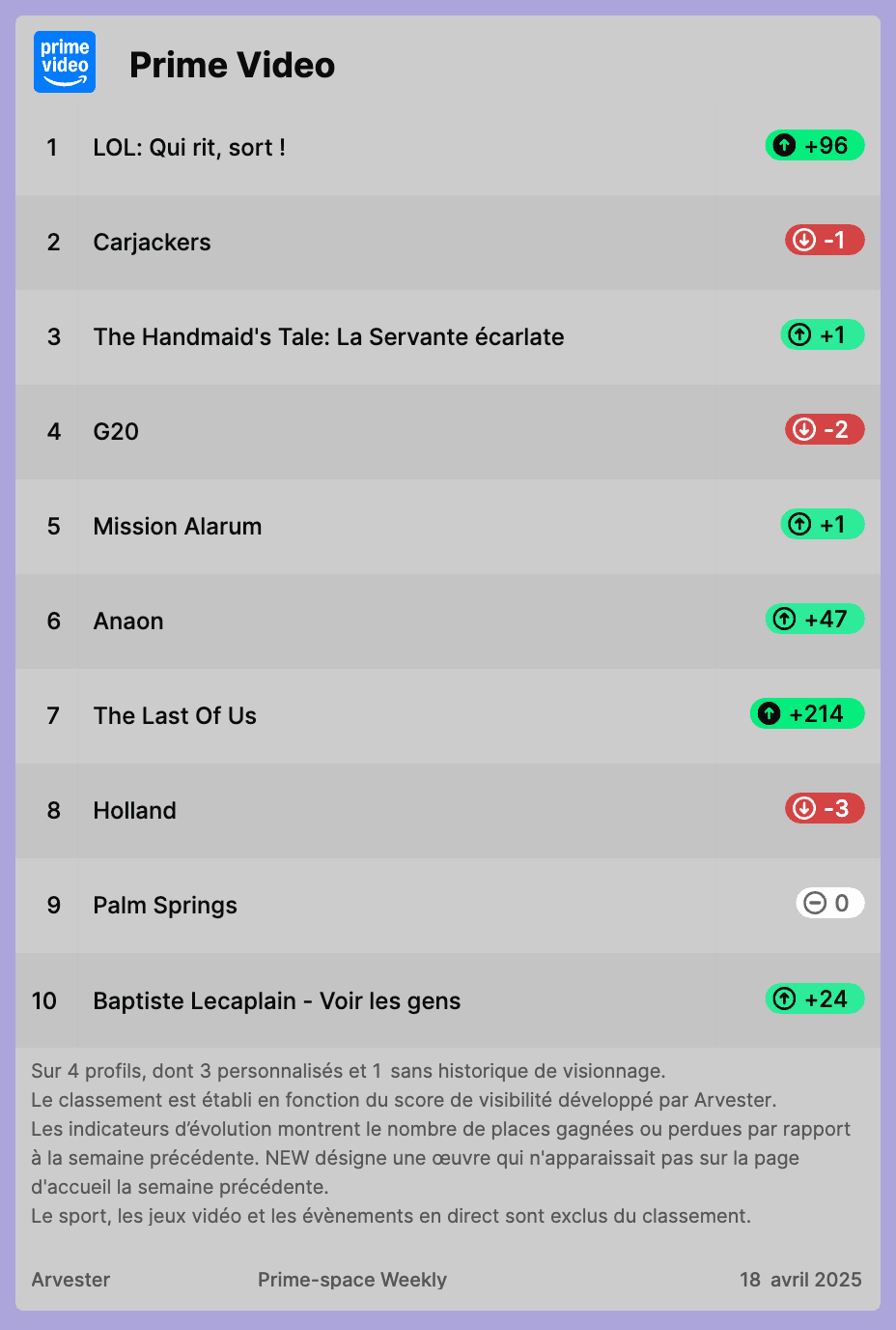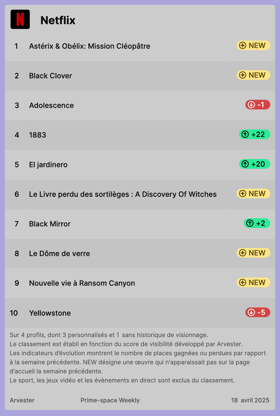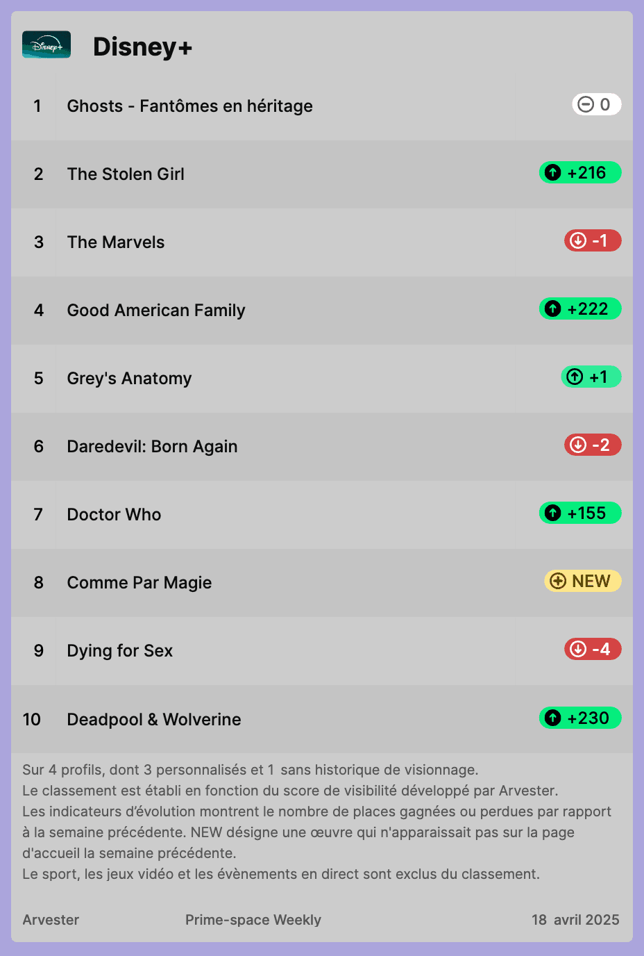 Vous trouverez ci-dessous les 10 titres les plus visibles sur Netflix, Prime Video et Disney+ en France. Plus d'infos sur notre méthodologie en bas de page.