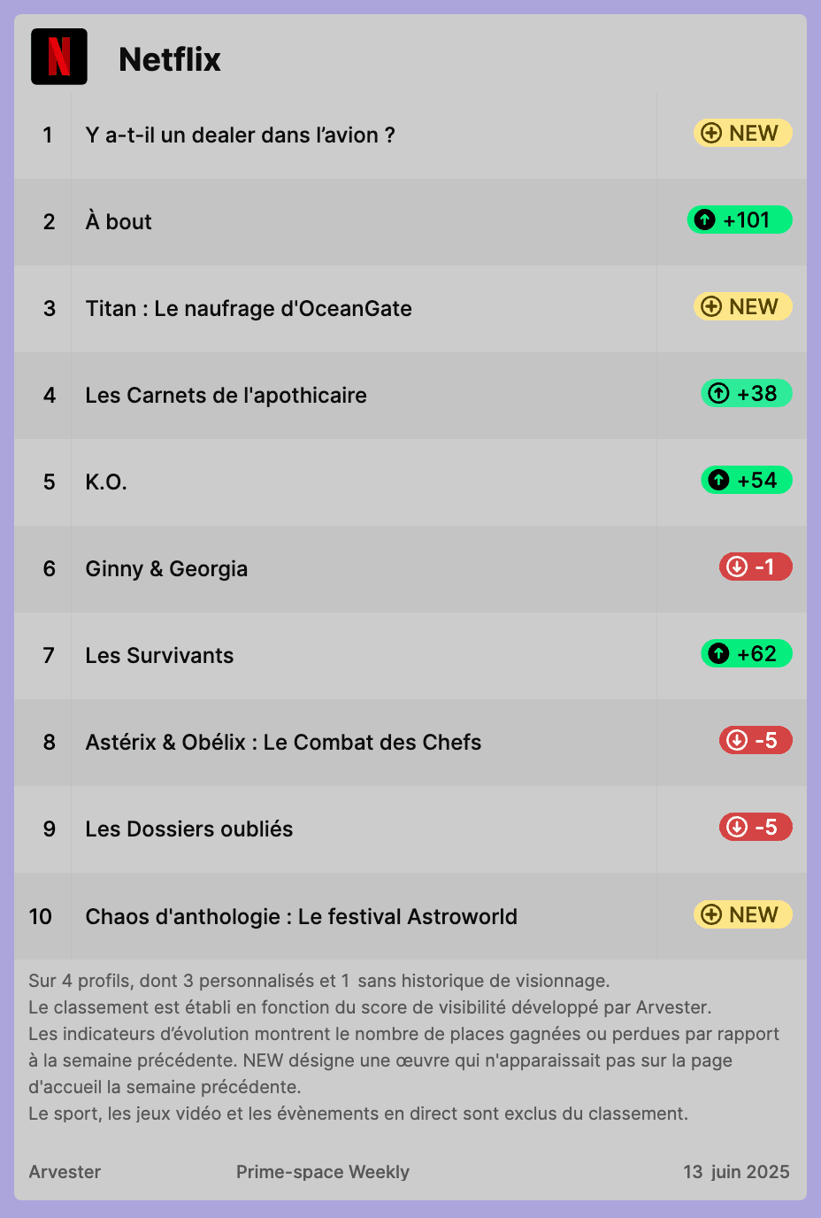 Notre classement hebdomadaire des titres les plus visibles sur Netflix, Prime Video et Disney+