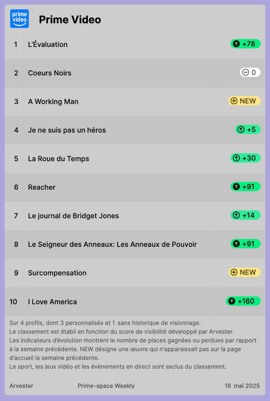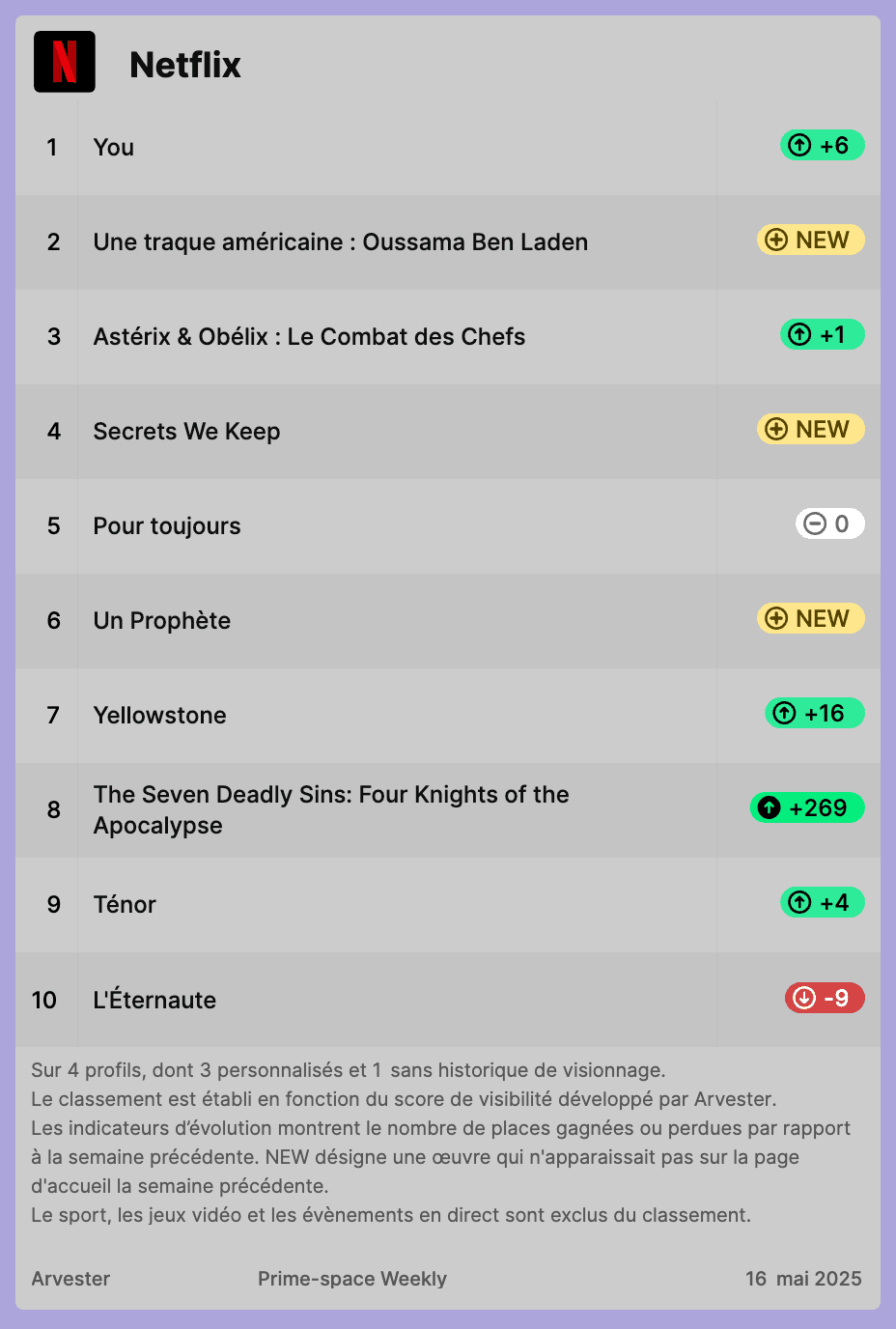 Notre classement hebdomadaire des titres les plus visibles sur Netflix, Prime Video et Disney+