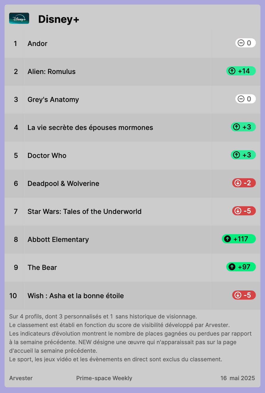 Vous trouverez ci-dessous les 10 titres les plus visibles sur Netflix, Prime Video et Disney+ en France. Plus d'infos sur notre méthodologie en bas de page
