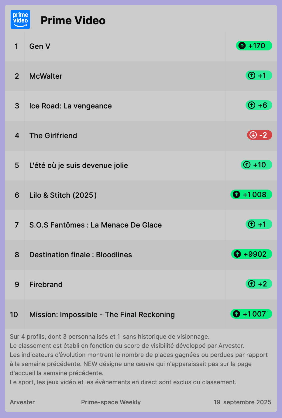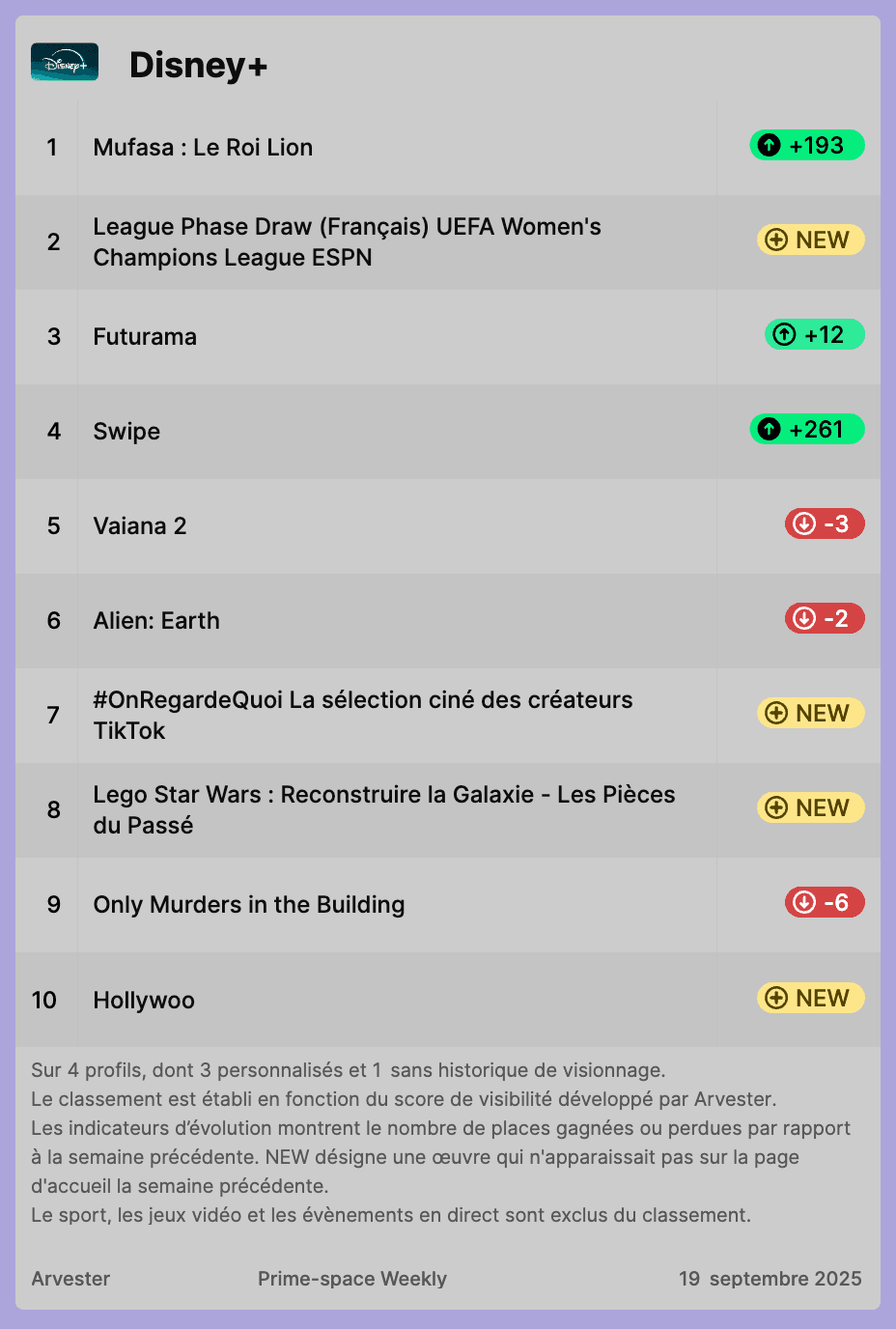Notre classement hebdomadaire des titres les plus visibles sur Netflix, Prime Video et Disney+
