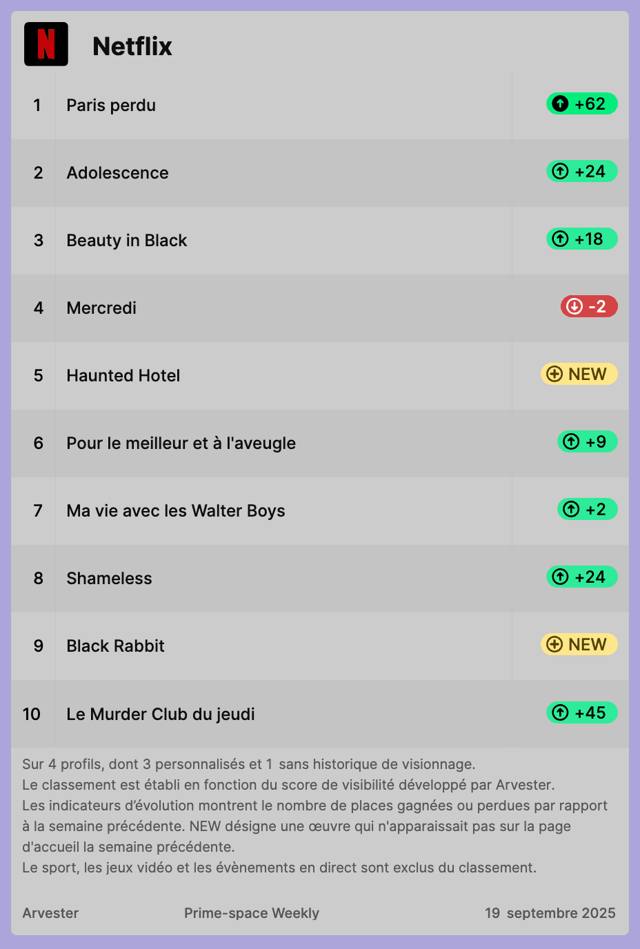 Vous trouverez ci-dessous les 10 titres les plus visibles sur Netflix, Prime Video et Disney+ en France. Plus d'infos sur notre méthodologie en bas de page.