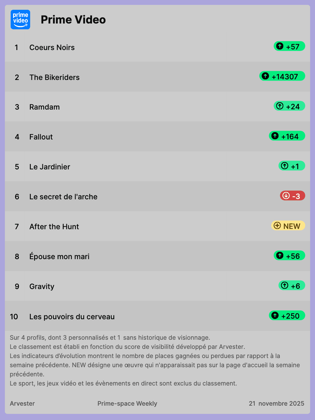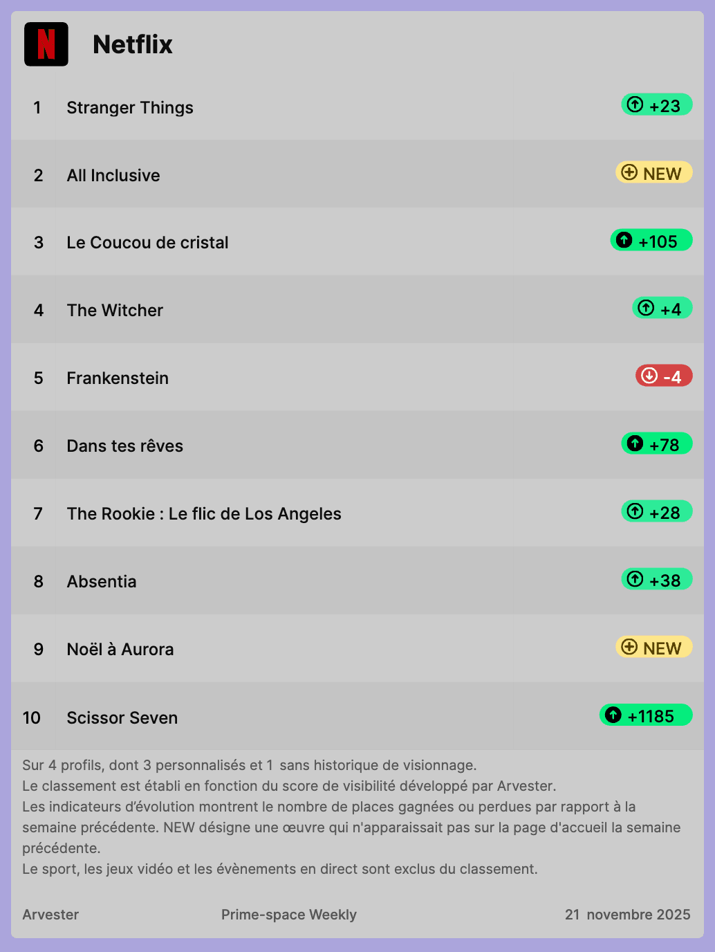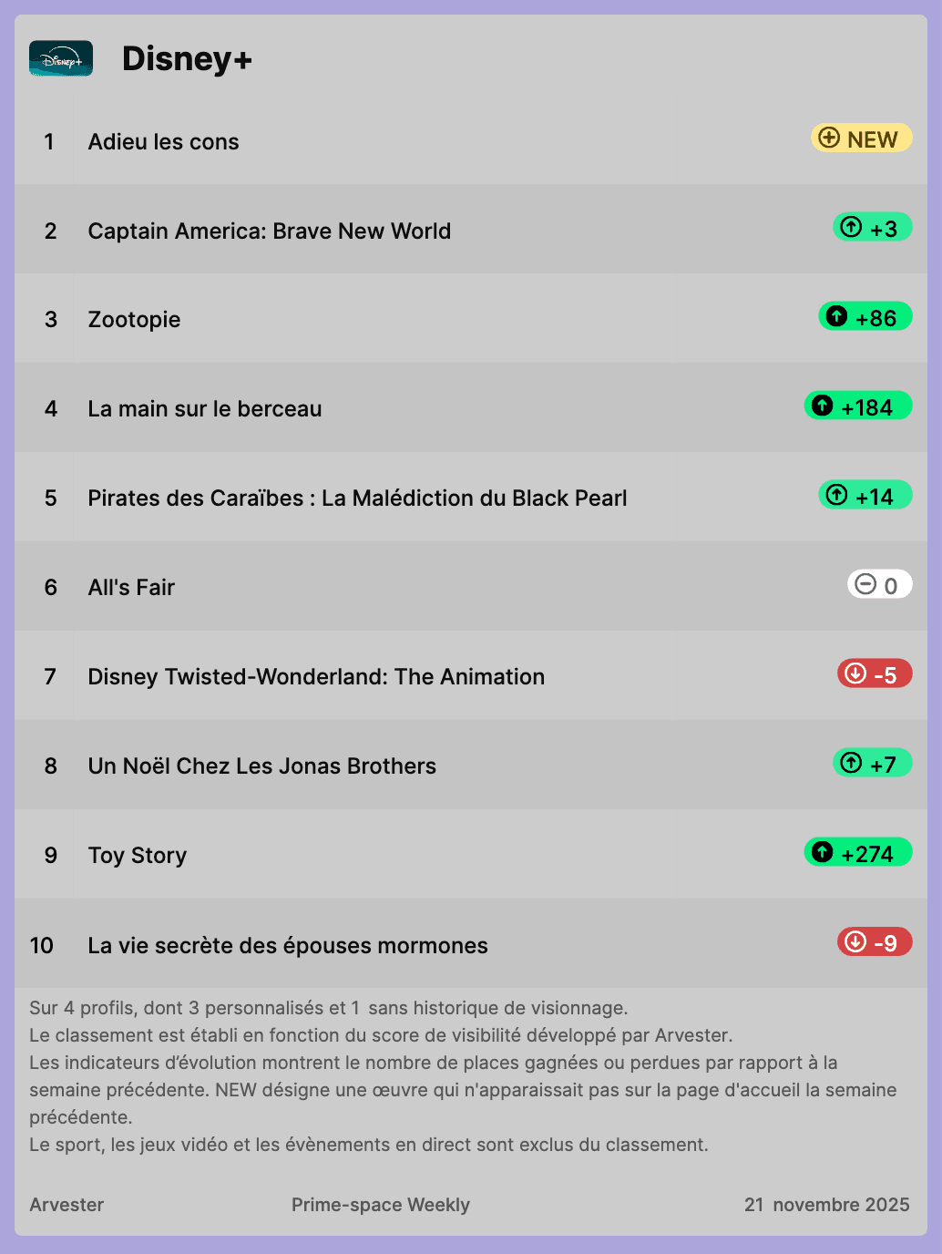 Vous trouverez ci-dessous les 10 titres les plus visibles sur Netflix, Prime Video et Disney+ en France. Plus d'infos sur notre méthodologie en bas de page.