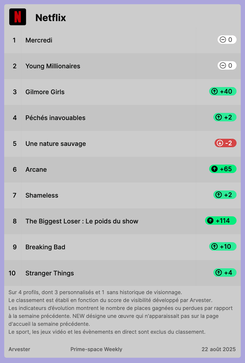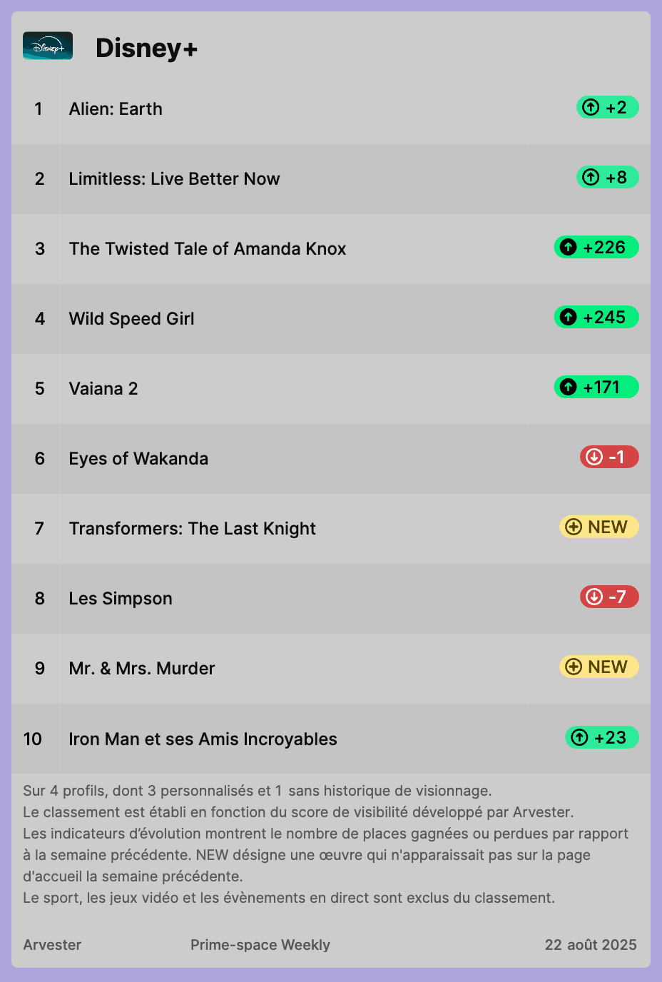 Notre classement hebdomadaire des titres les plus visibles sur Netflix, Prime Video et Disney+