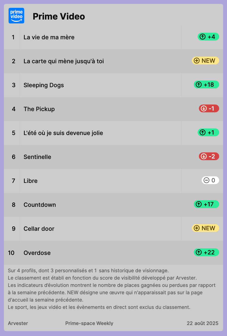 Vous trouverez ci-dessous les 10 titres les plus visibles sur Netflix, Prime Video et Disney+ en France. Plus d'infos sur notre méthodologie en bas de page.