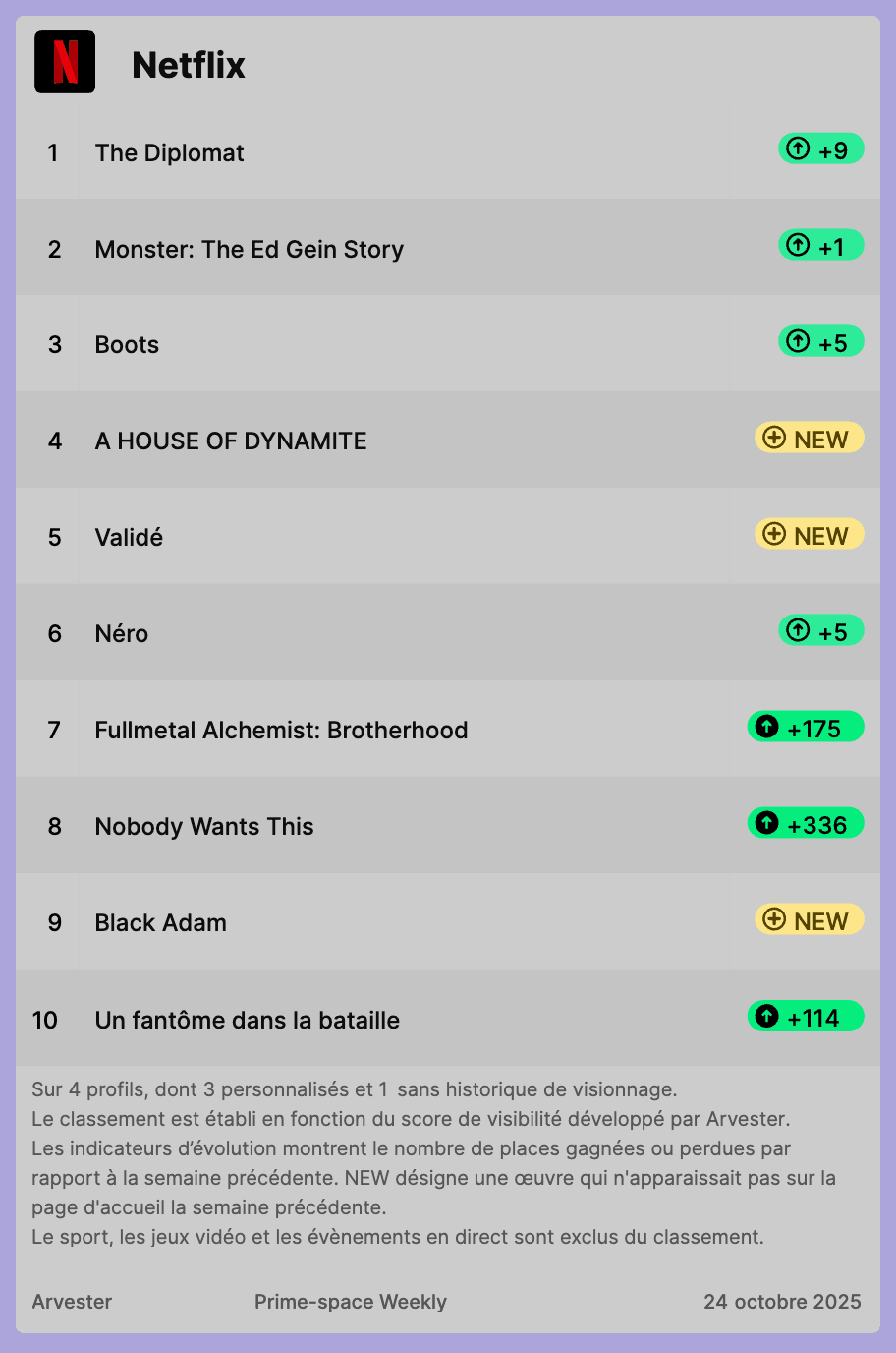 Vous trouverez ci-dessous les 10 titres les plus visibles sur Netflix, Prime Video et Disney+ en France. Plus d'infos sur notre méthodologie en bas de page.