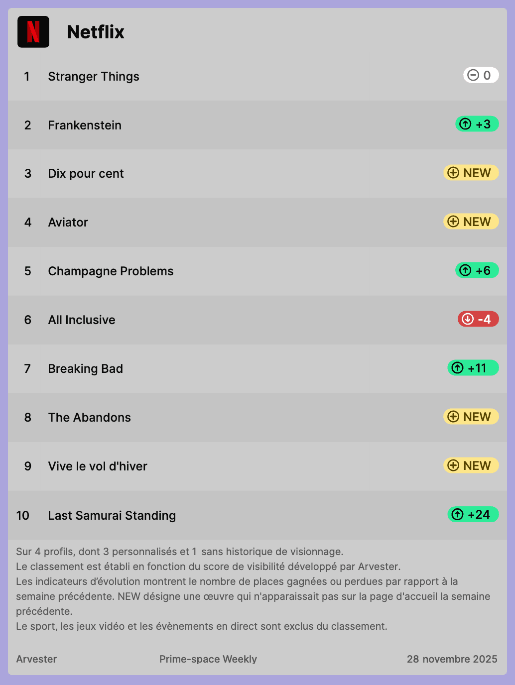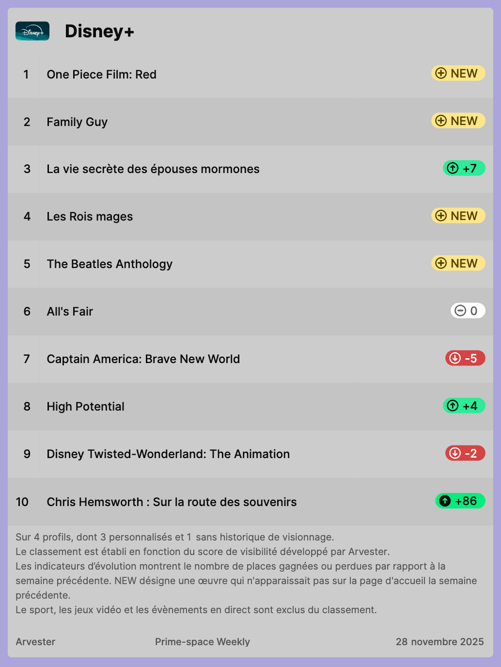 Notre classement hebdomadaire des titres les plus visibles sur Netflix, Prime Video et Disney+