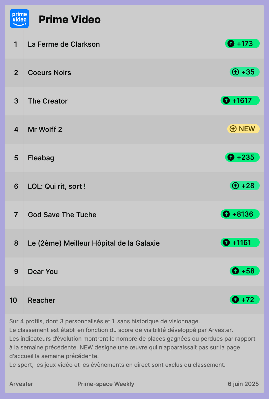 Vous trouverez ci-dessous les 10 titres les plus visibles sur Netflix, Prime Video et Disney+ en France. Plus d'infos sur notre méthodologie en bas de page.