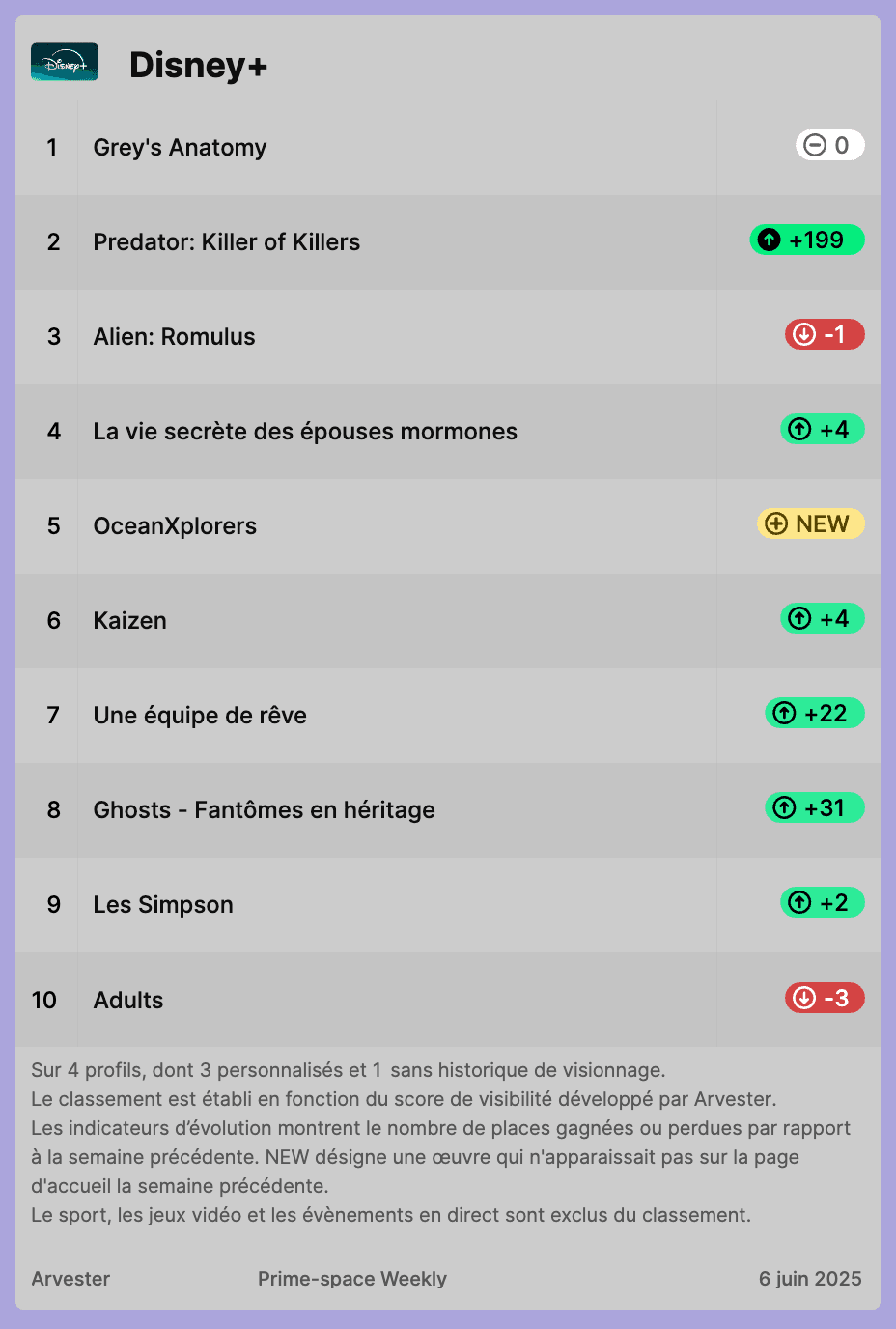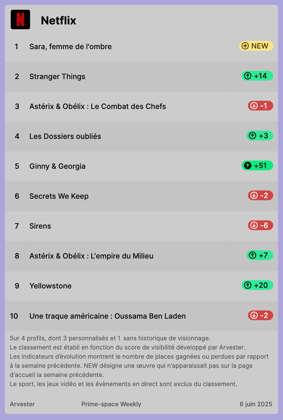 Notre classement hebdomadaire des titres les plus visibles sur Netflix, Prime Video et Disney+