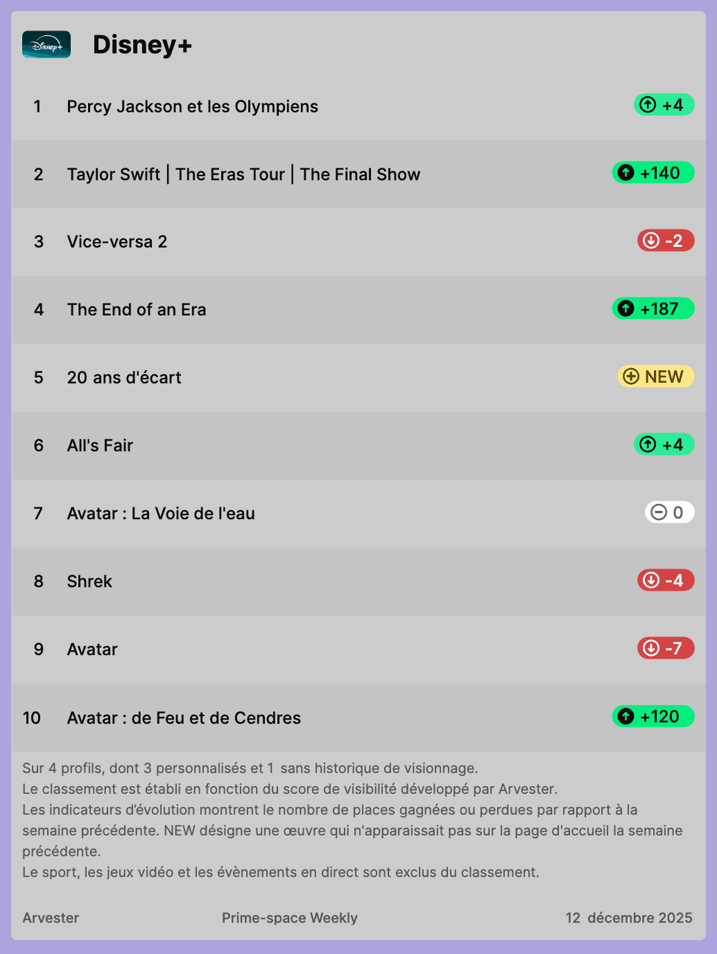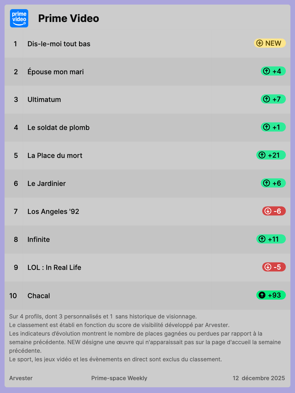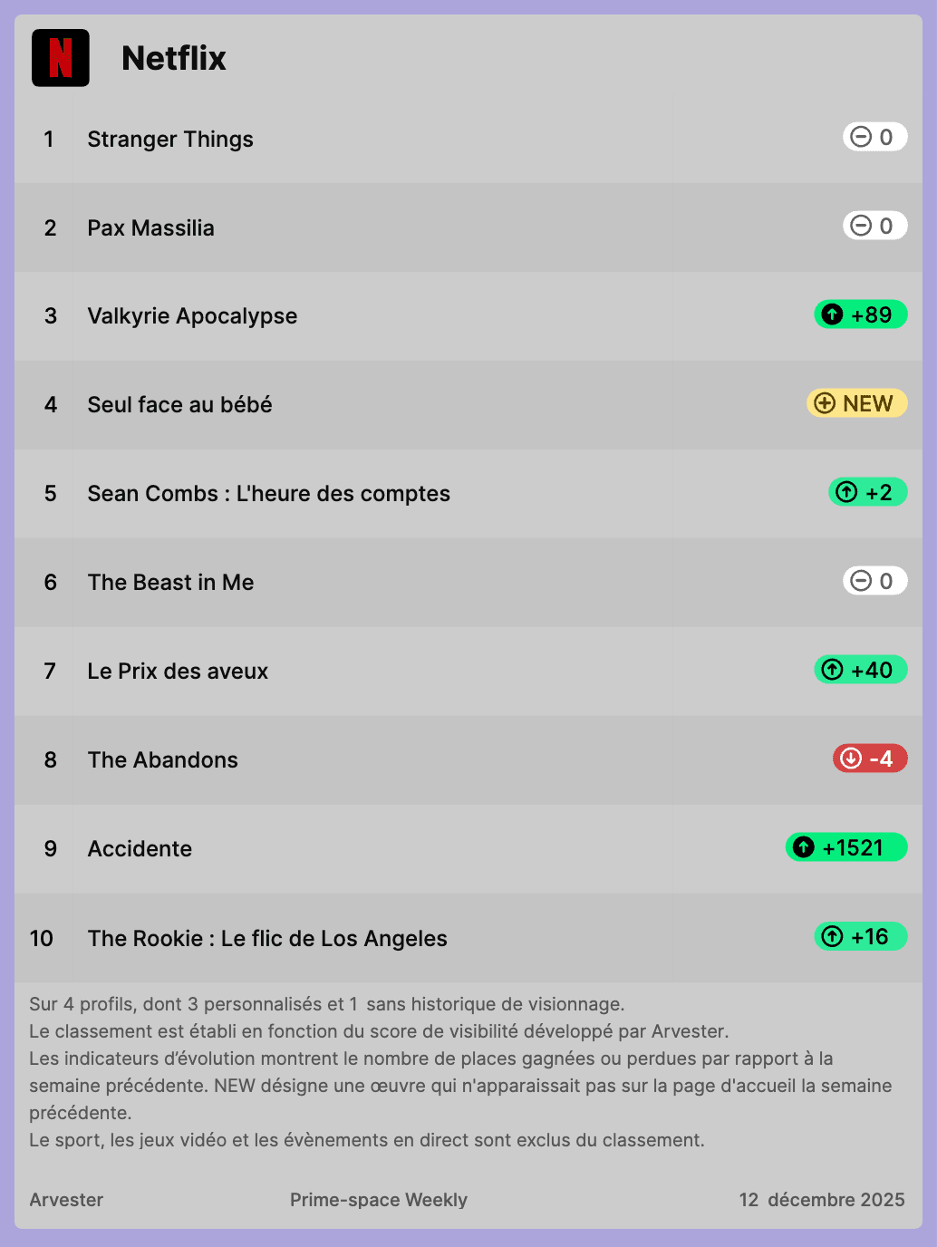 Arvester's weekly rankings of the most visible titles on Netflix, Prime Video and Disney+