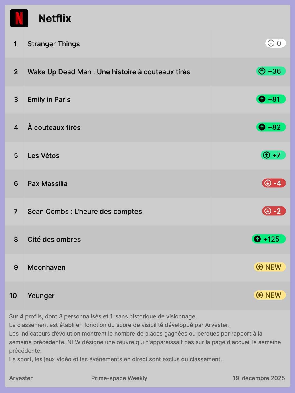 You'll find below the 10 most visible titles on the homepages of Netflix, Prime Video and Disney+ in France. Scroll further down for more info on our methodology.