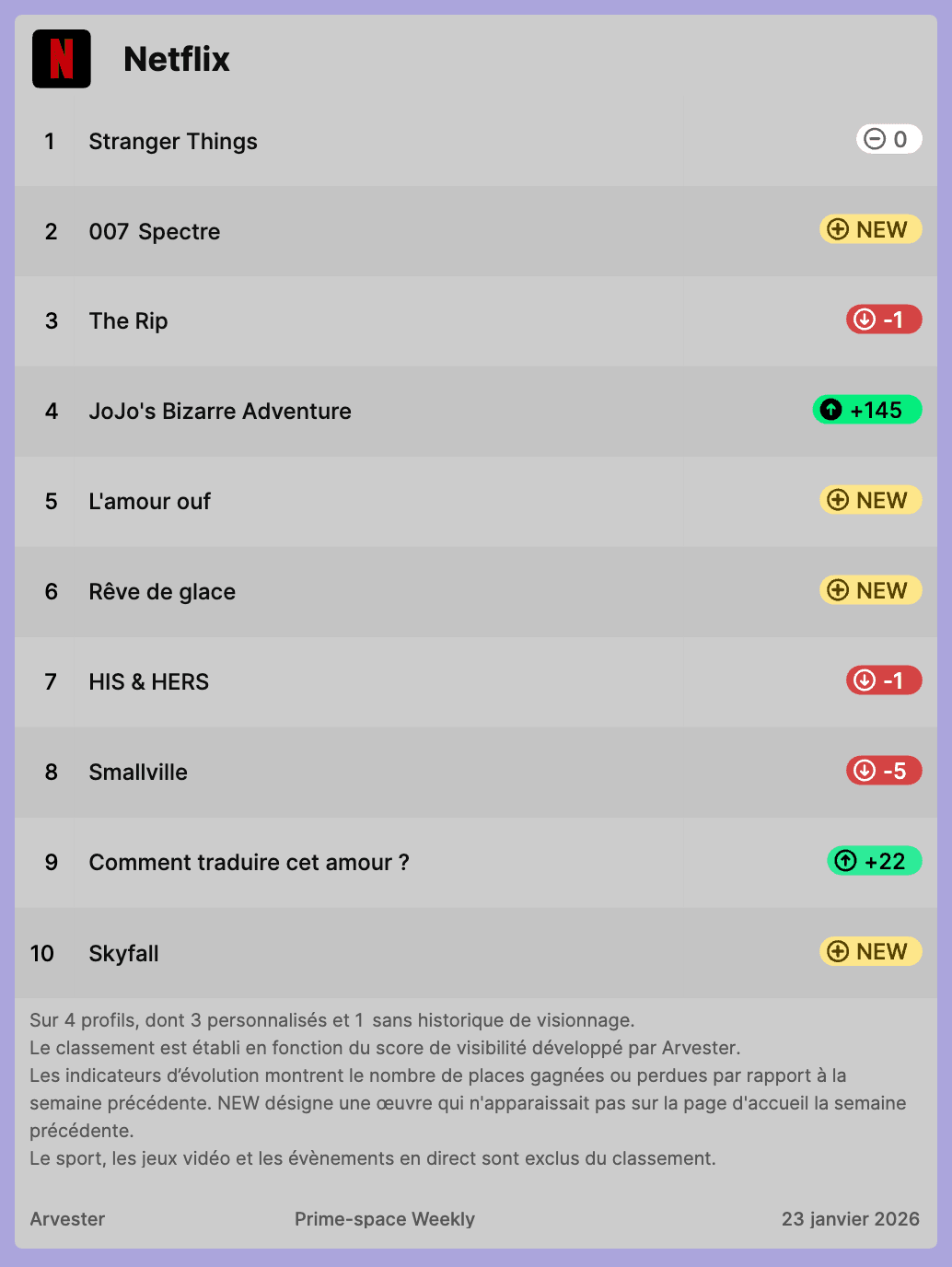 Arvester's weekly rankings of the most visible titles on Netflix, Prime Video and Disney+