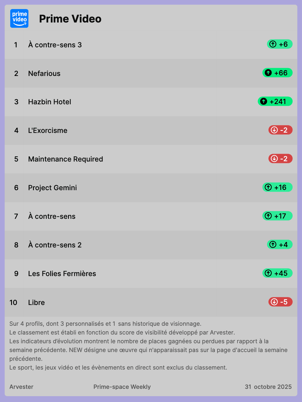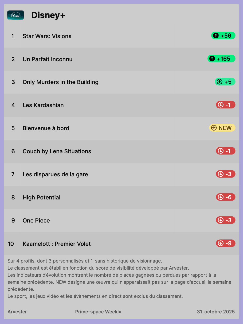 You'll find below the 10 most visible titles on the homepages of Netflix, Prime Video and Disney+ in France. Scroll further down for more info on our methodology.