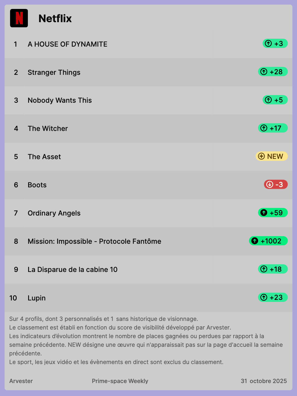 Arvester's weekly rankings of the most visible titles on Netflix, Prime Video and Disney+