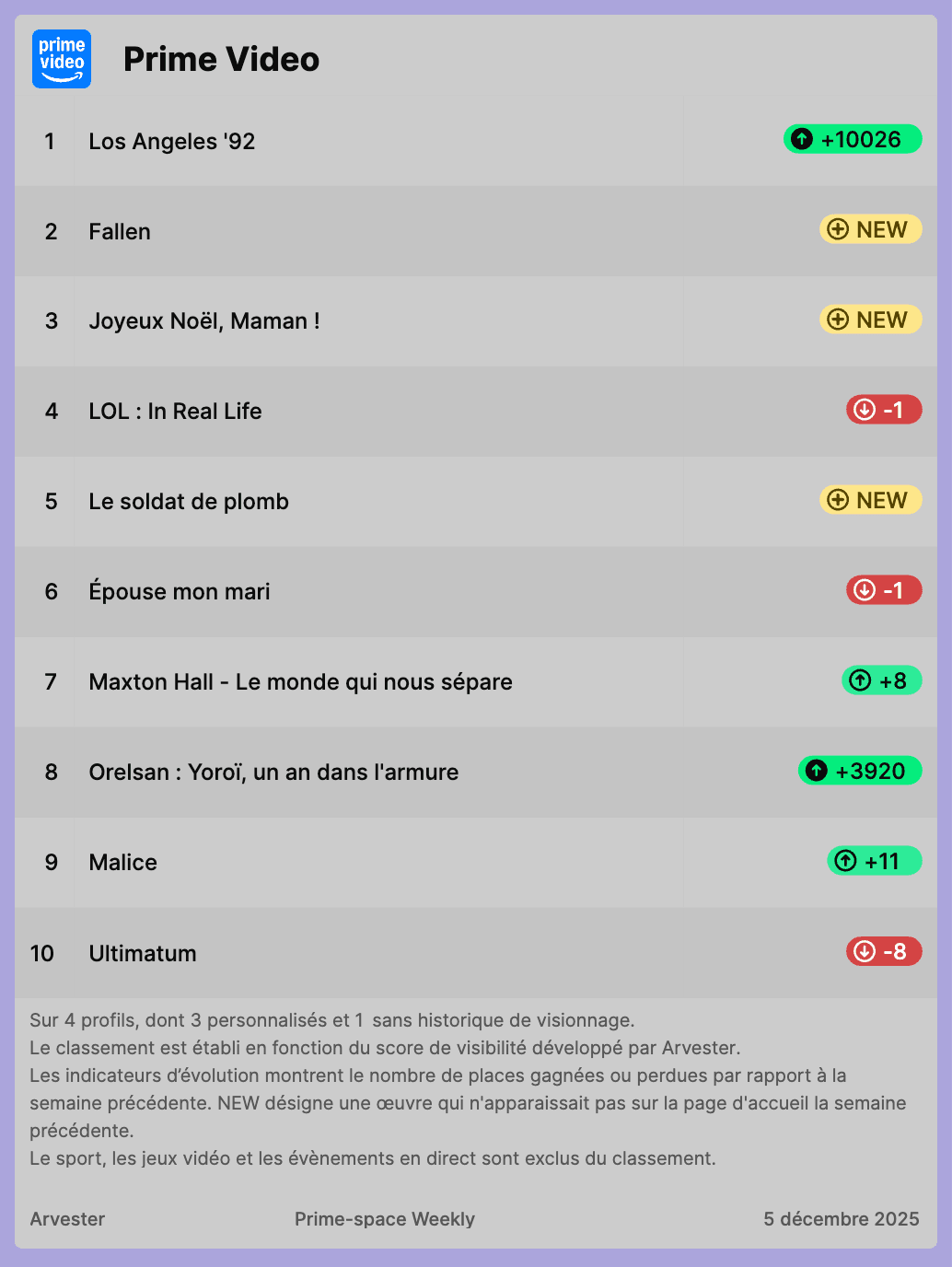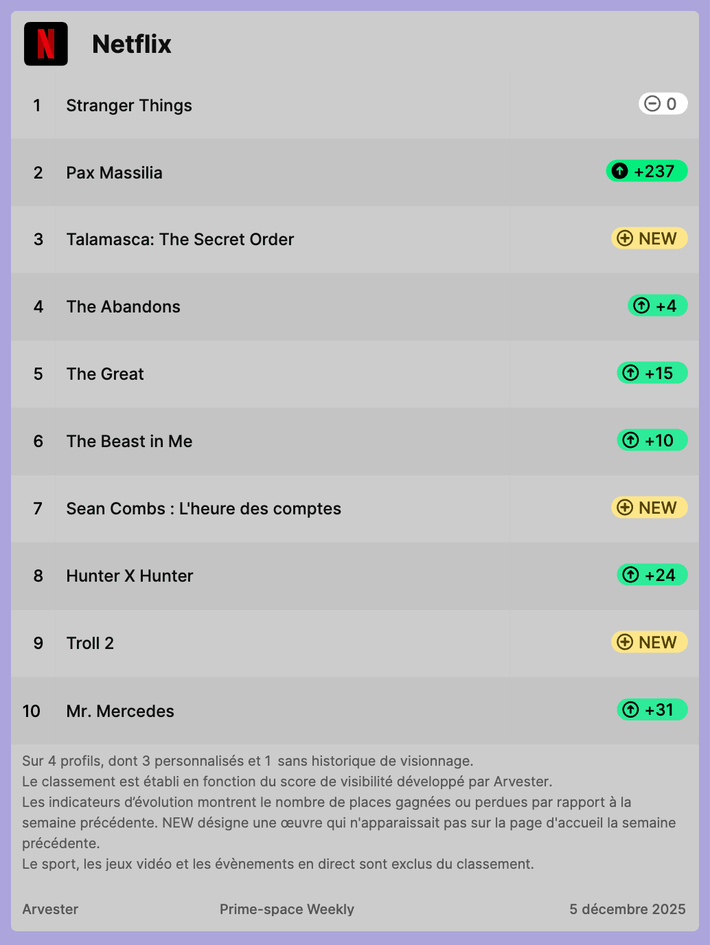 Arvester's weekly rankings of the most visible titles on Netflix, Prime Video and Disney+