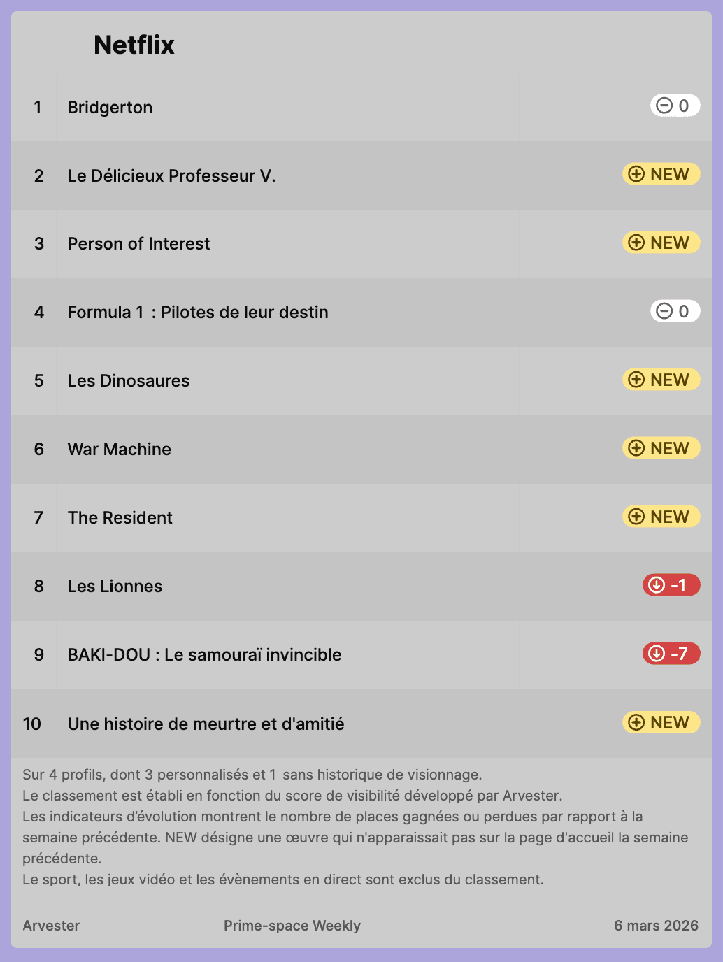 Arvester's weekly rankings of the most visible titles on Netflix, Prime Video and Disney+.