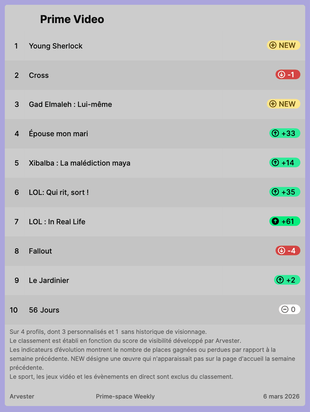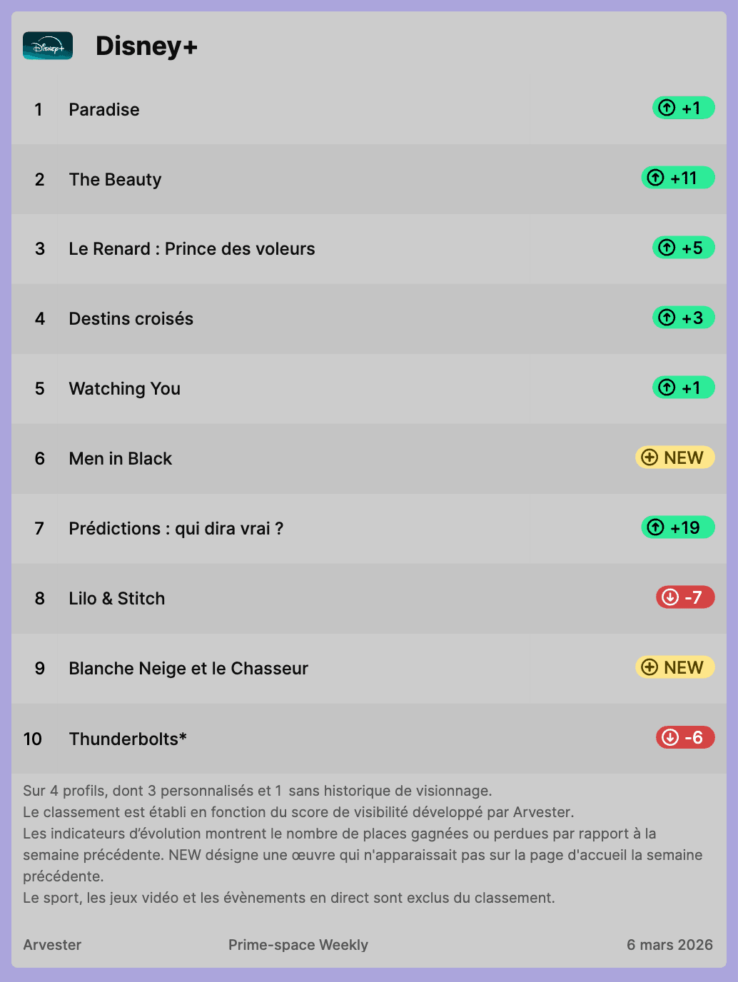 You'll find below the 10 most visible titles on the homepages of Netflix, Prime Video and Disney+ in France. Scroll further down for more info on our methodology.