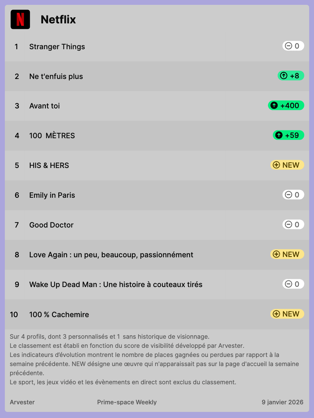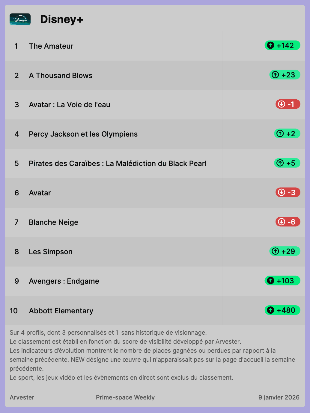 Arvester's weekly rankings of the most visible titles on Netflix, Prime Video and Disney+
